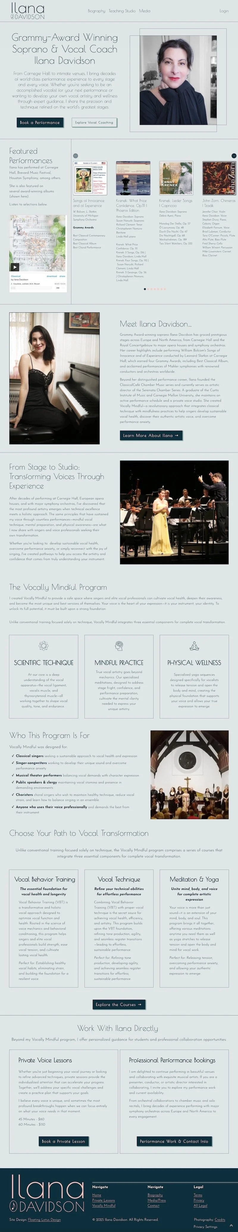 Home page: The first half of the home page establishes her professional expertise and accomplishments. The second half transitions to how that leads into her unique Vocally Mindful program of courses. The last section of the page would tie back to those interested in either booking a private lesson or booking a performance.