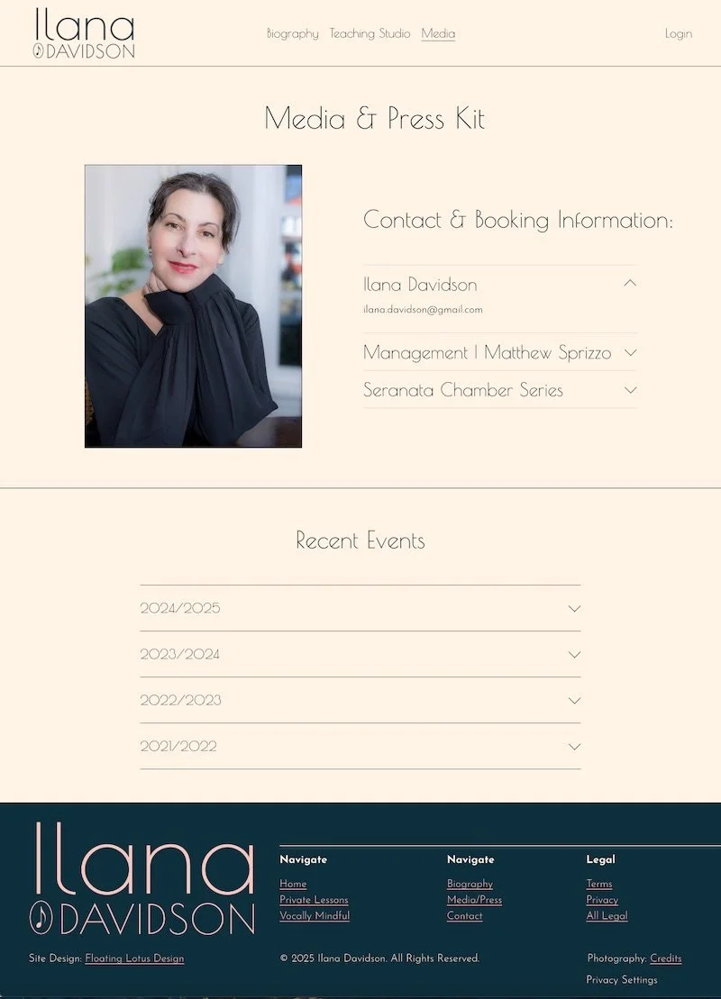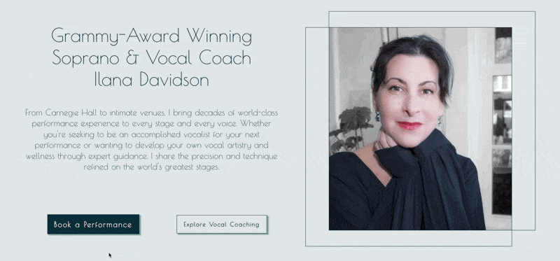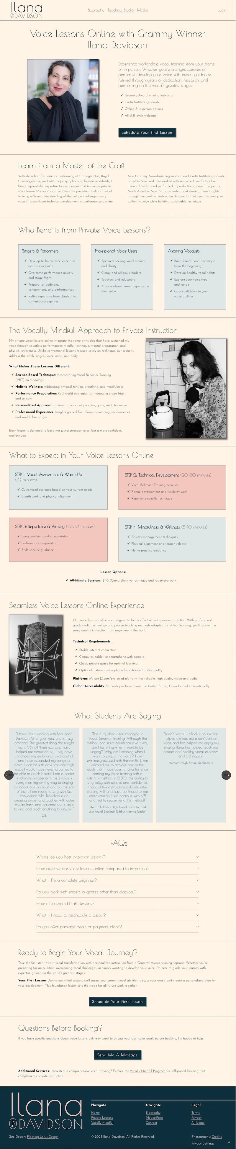 Private Lessons page: This page would further expand on her expertise as a vocal coach, her methods and approach, the process, and what to expect during a lesson. Includes a link to book lessons online.