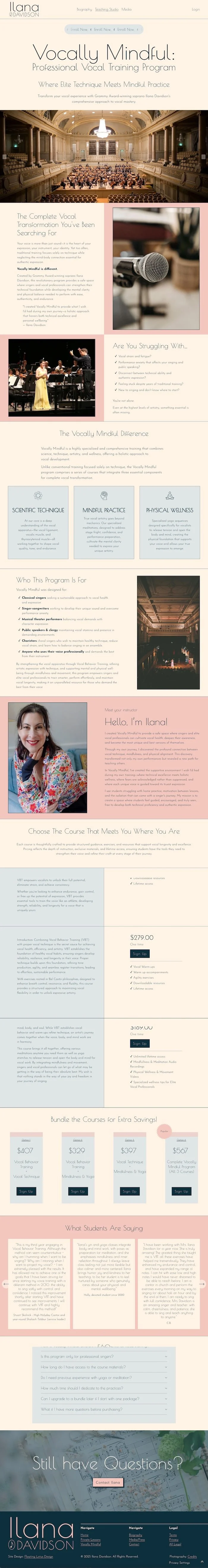Vocally Mindful page: The main landing page for her course program. A long-form sales page to walk through the history of the program, the benefits, who it’s for, FAQs, and the ability to purchase the courses individually and as bundles.